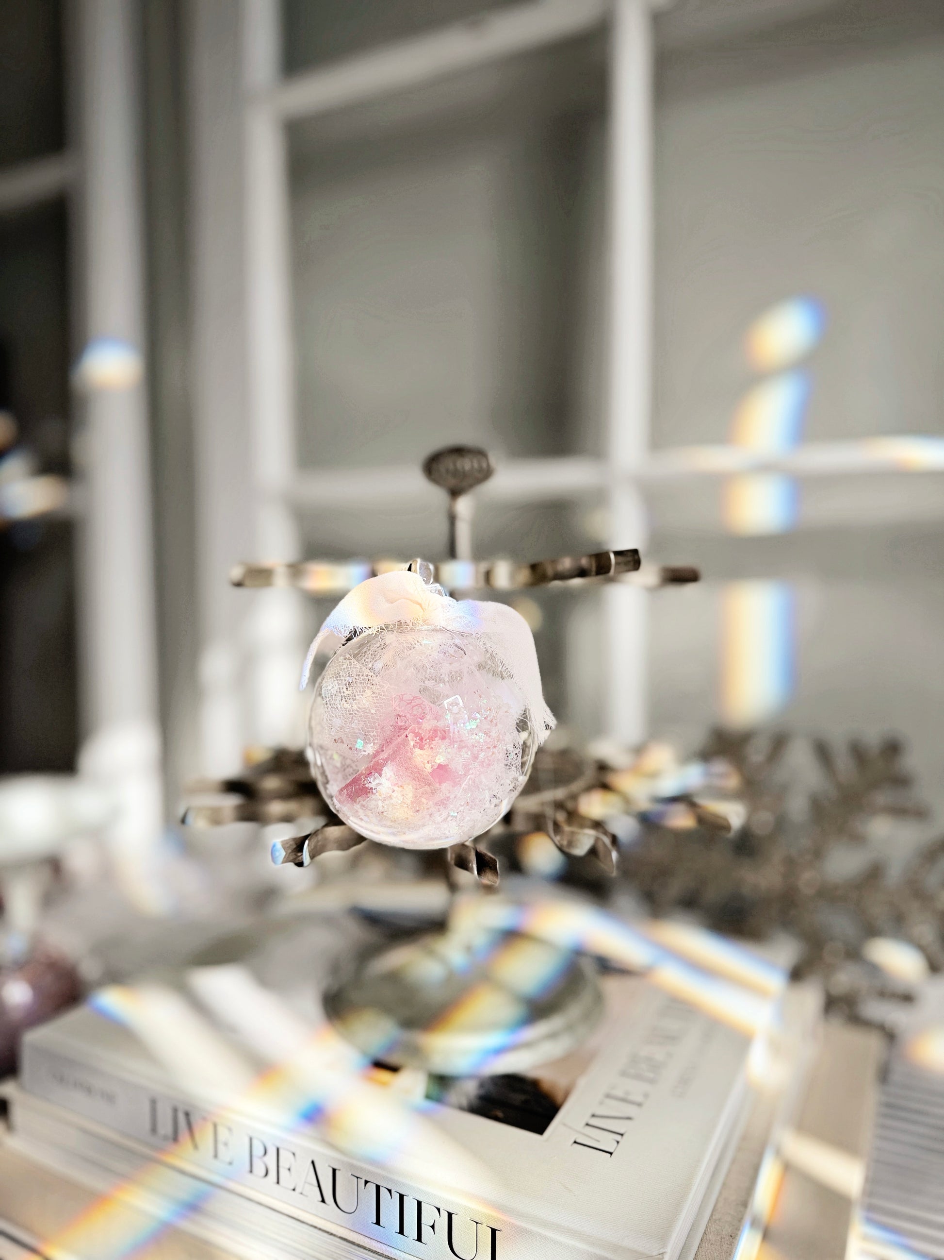 Delicate, dreamy, and full of holiday shimmer. This hand-filled glass ornament captures the quiet magic of winter with its frosted palette of blush pinks, silvery tulle, iridescent sparkle, and vintage-style silver tinsel. Every detail is chosen and layered by hand, creating a one-of-a-kind piece that feels like it belongs in a vintage snow globe.