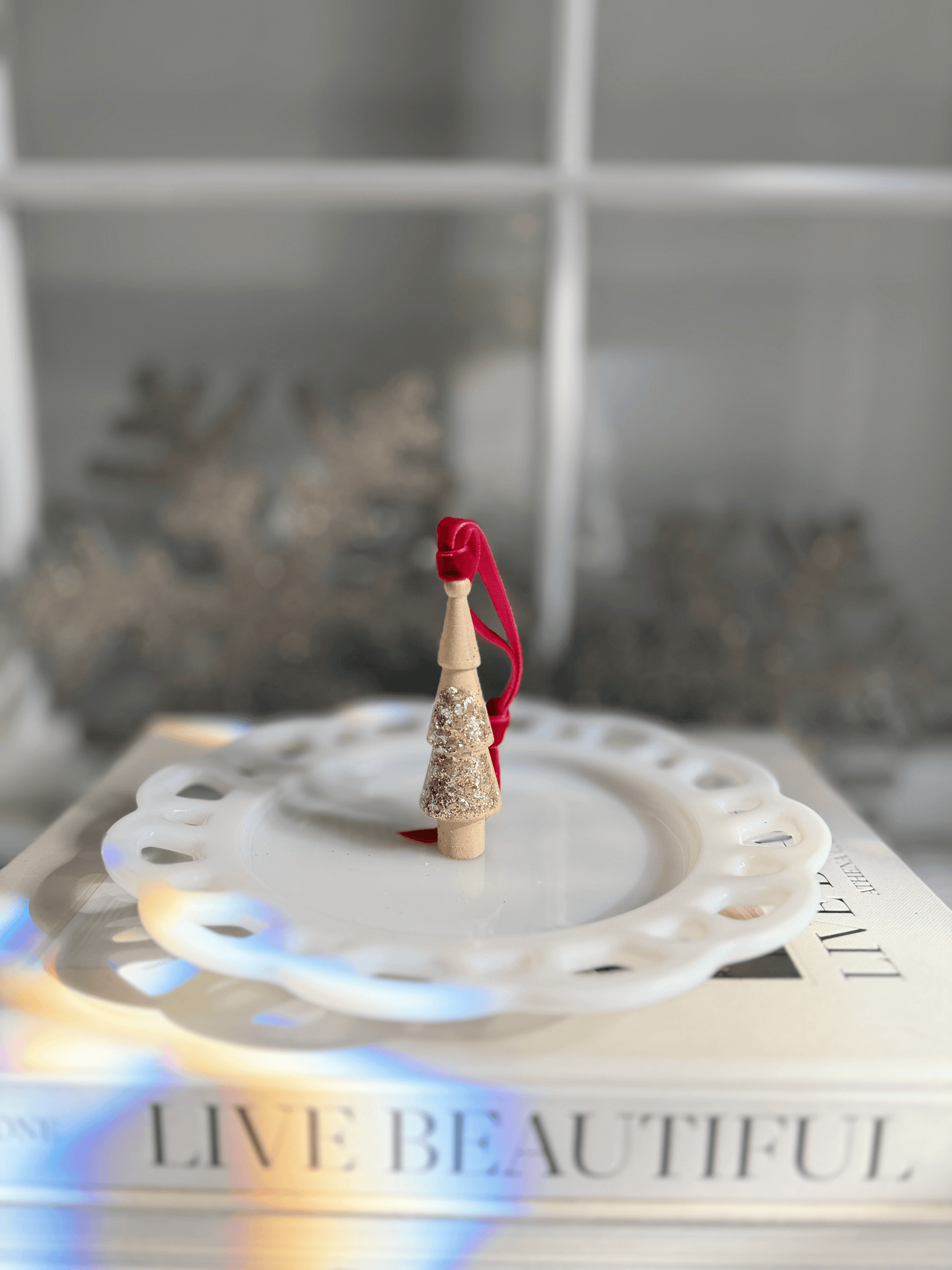 A shimmering woodland accent for your holiday collection. This handcrafted mini tree is made of natural wood, dressed in a mix of fine gold glitter and crushed mica, and tied with a classic red velvet ribbon. It’s equal parts rustic charm and heirloom sparkle — perfect for mantels, place settings, or as a sweet standalone gift.