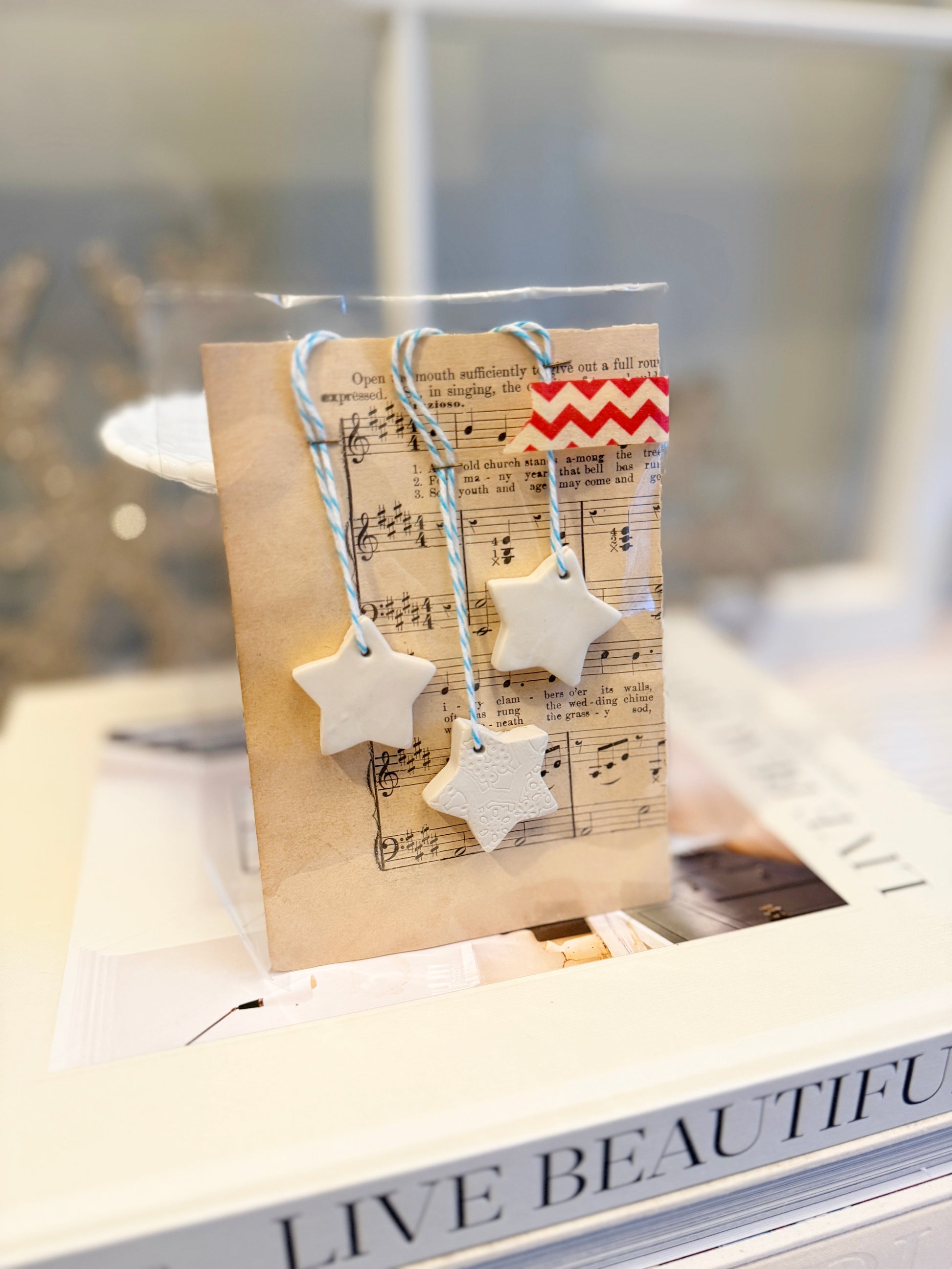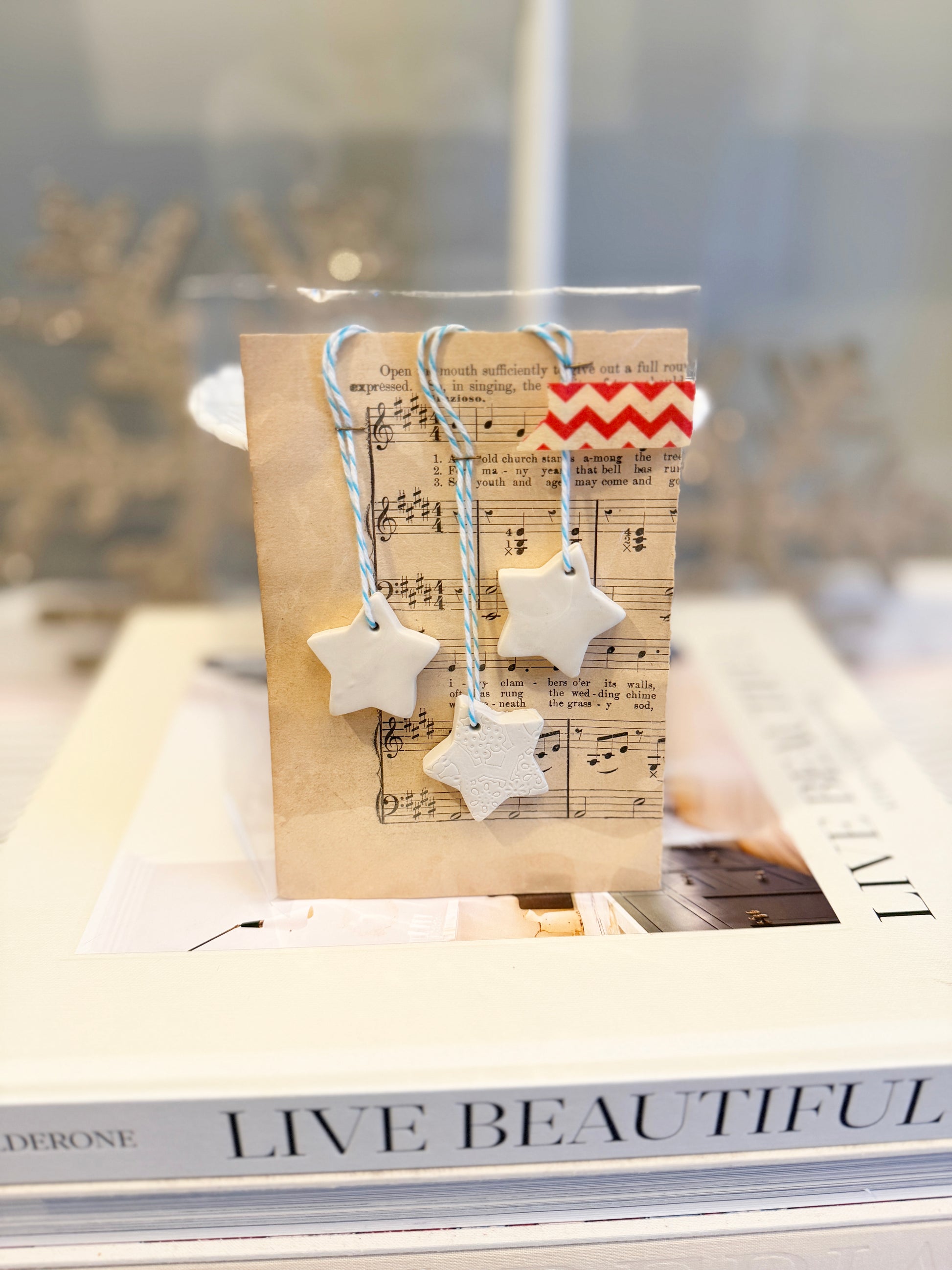 A tiny trio of charm. This set of three petite star ornaments is hand-pressed from clay and finished with classic blue-and-white baker’s twine. Each star measures just about 1 inch across — the perfect size for a delicate accent on your holiday tree, tied onto a gift, or tucked into a stocking.