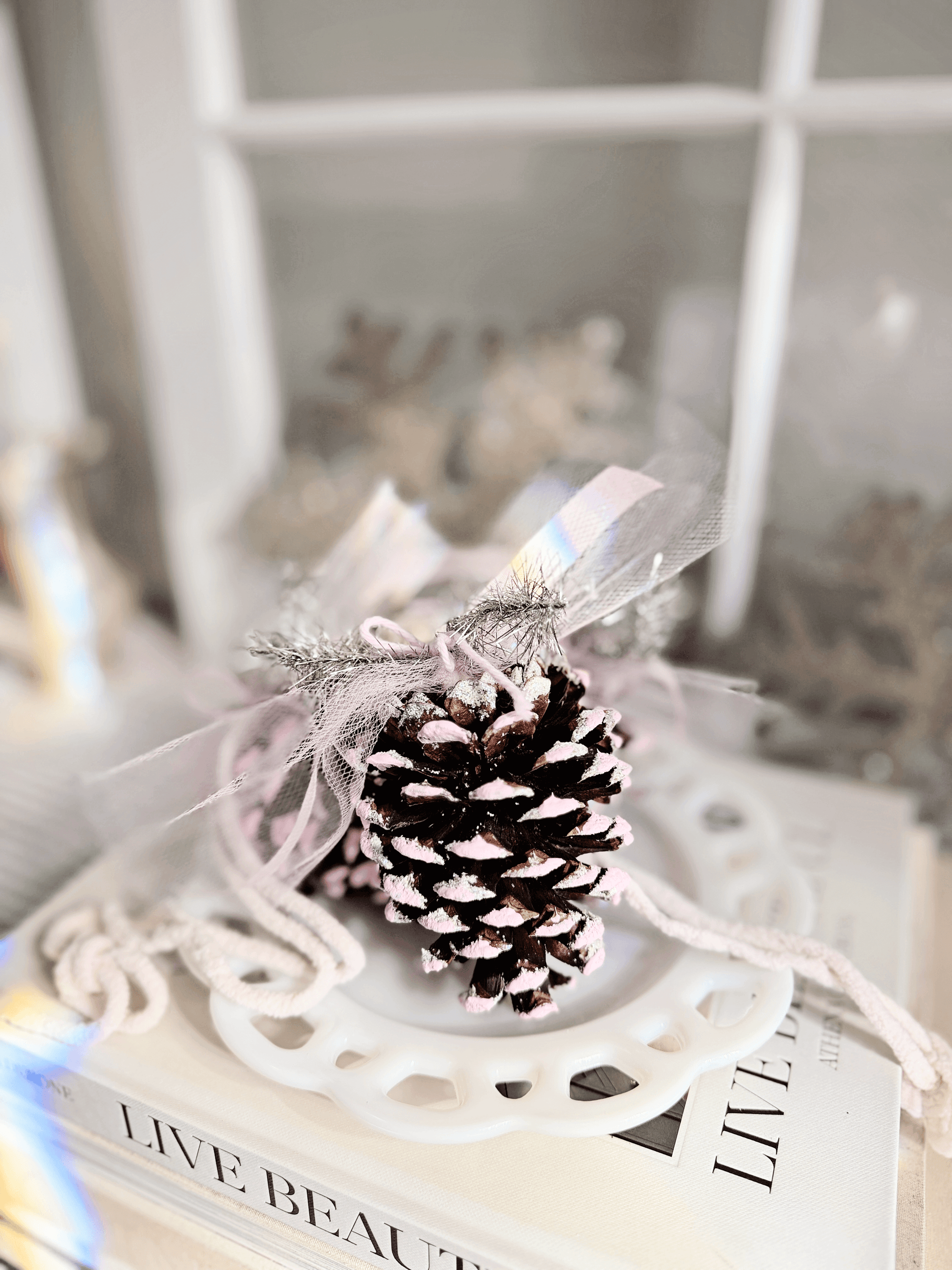 These hand-painted pinecones are dipped in glitter and topped with the softest, most luxurious ribbons and fibers — like something pulled from a pink winter daydream. Each ornament is finished with thick, swoon-worthy yarn in soft pink, layered with tulle, seam binding, and a touch of vintage-style silver tinsel.