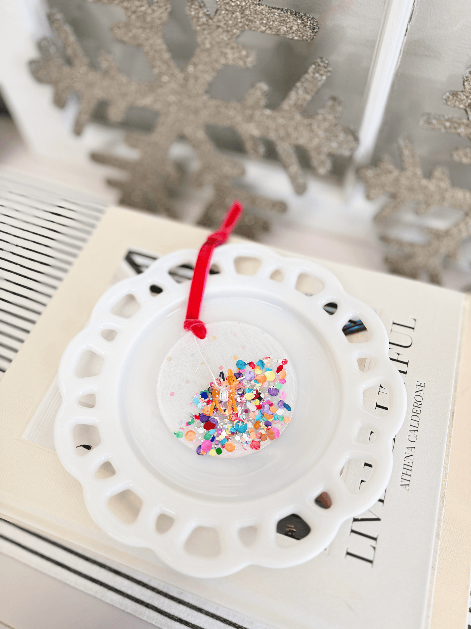 Hand-painted and decoupaged with a mix of glitter, sequins + confetti