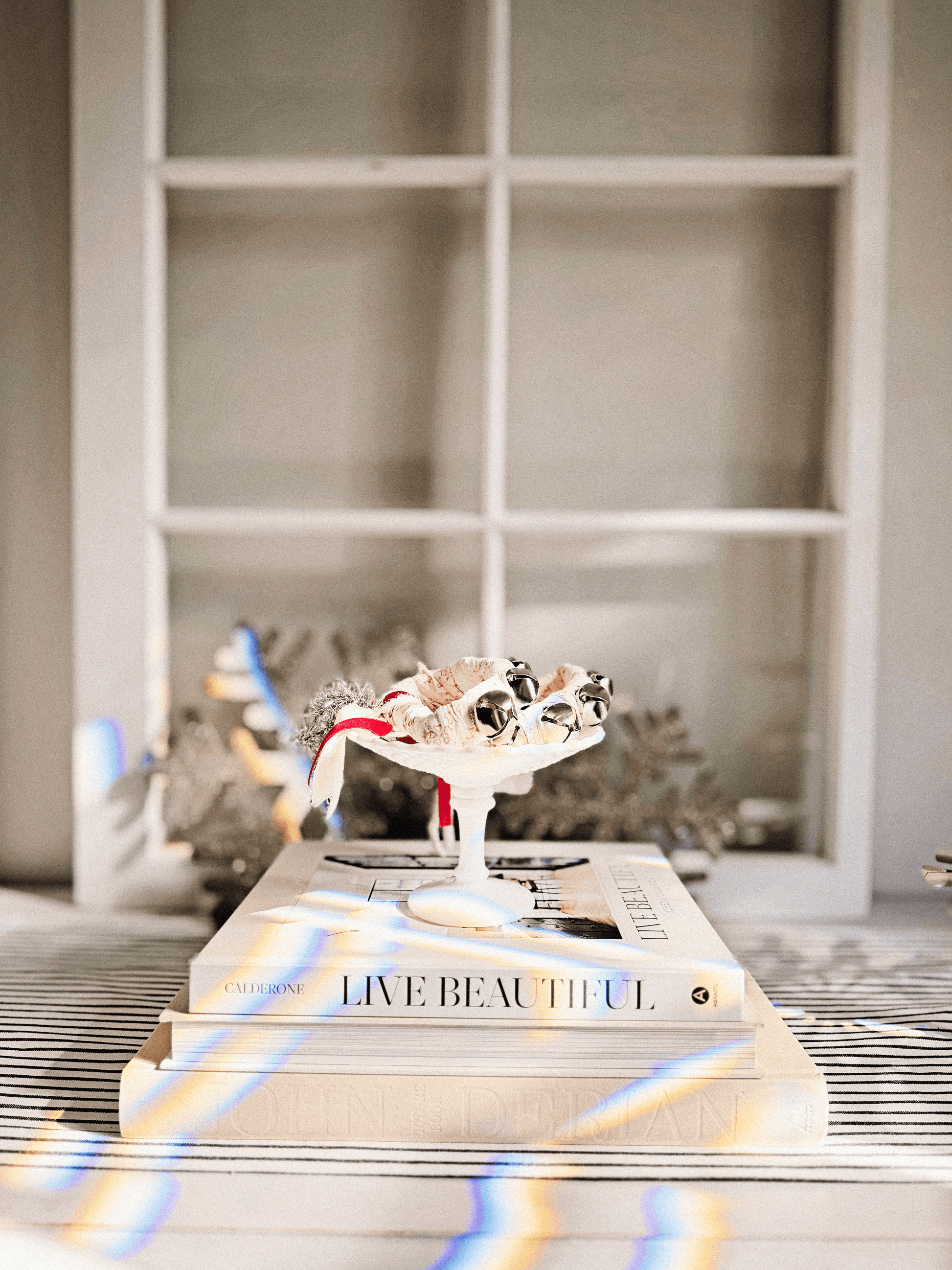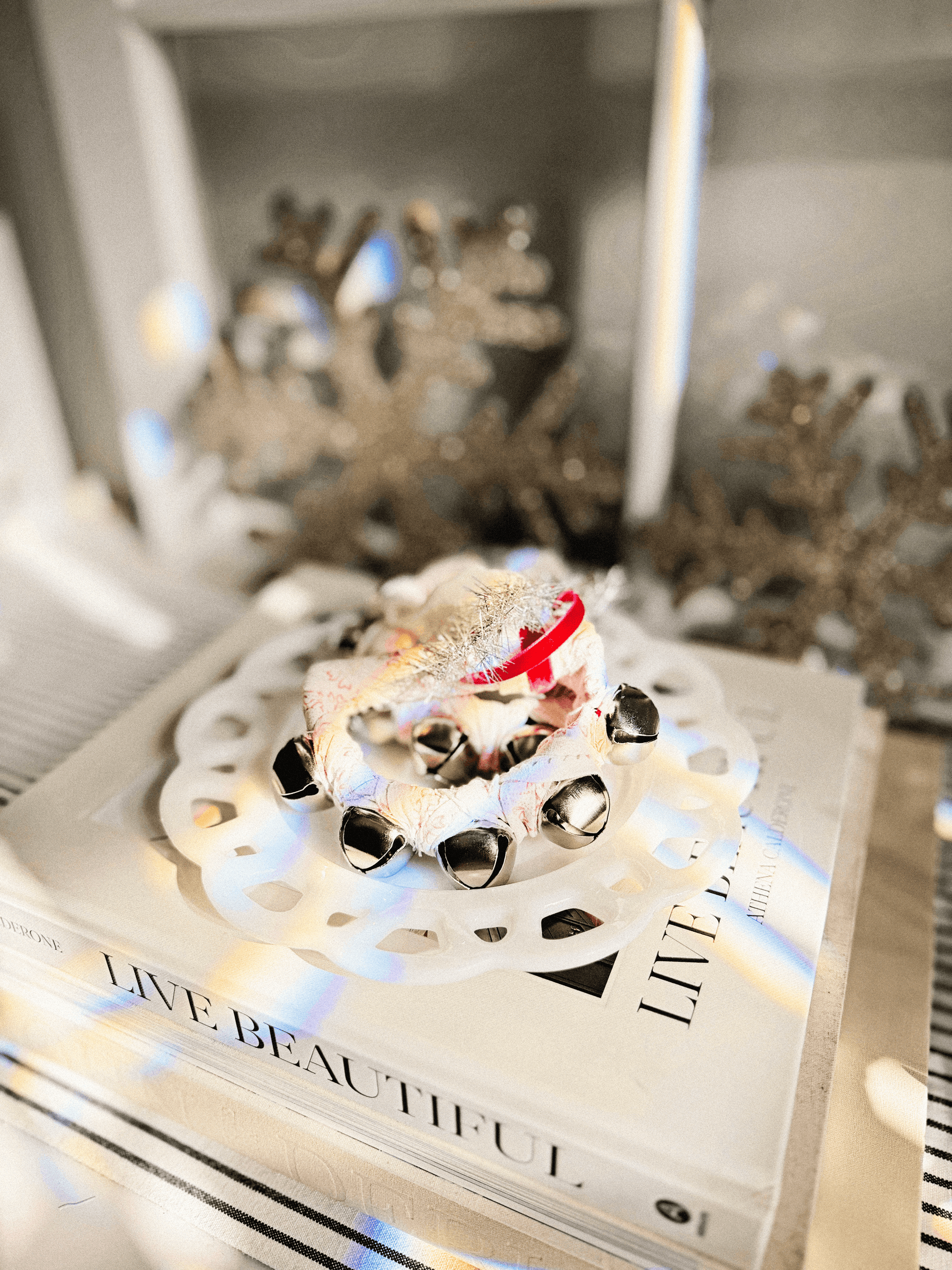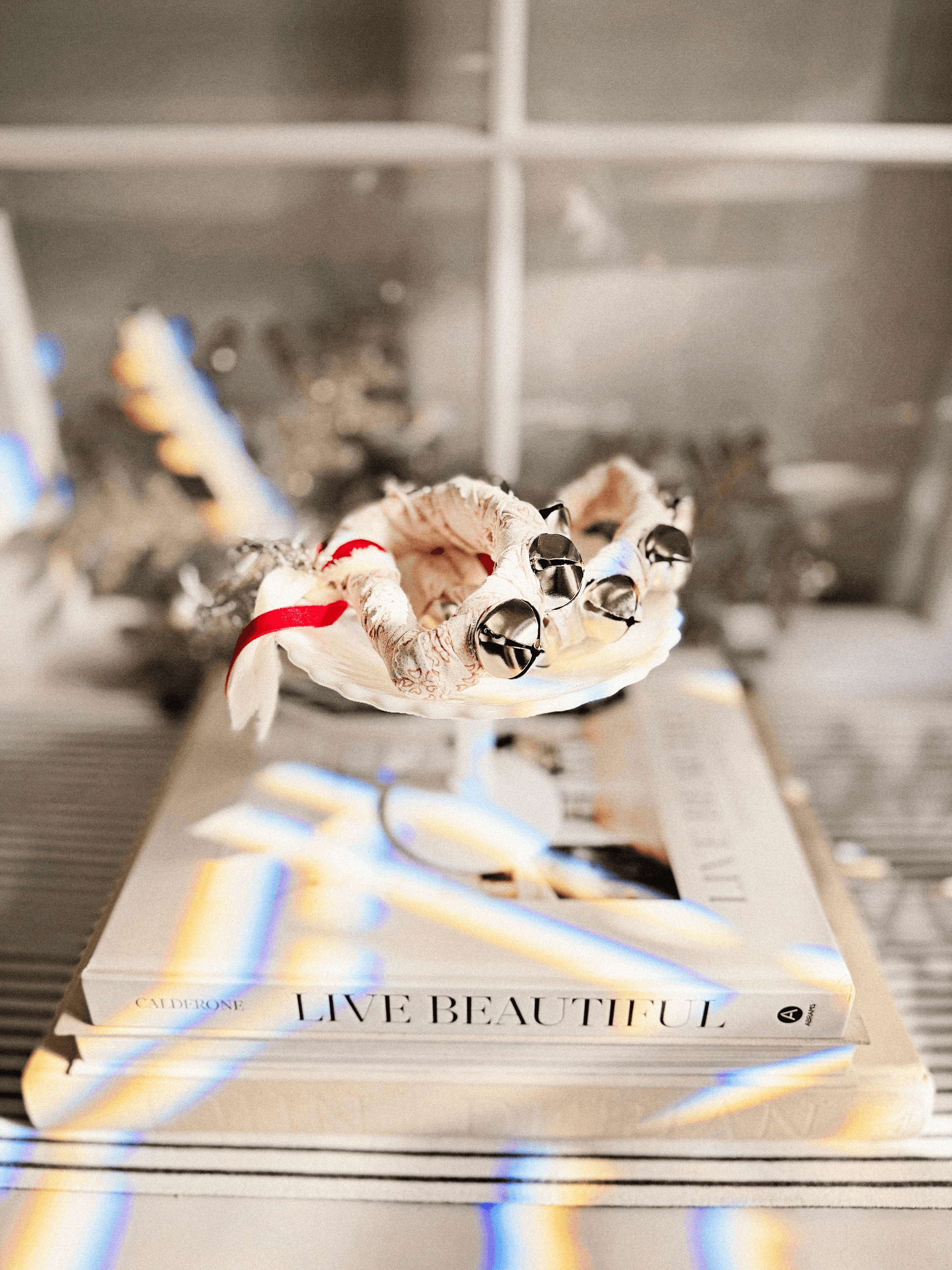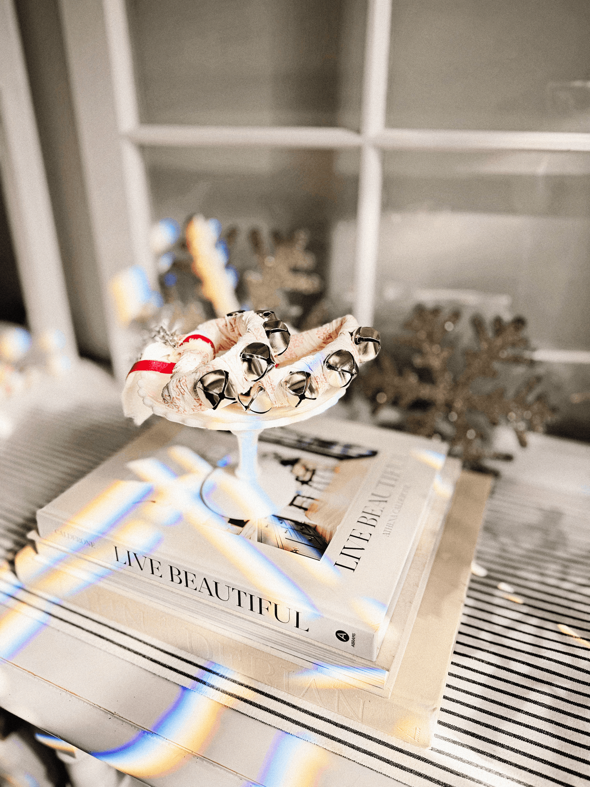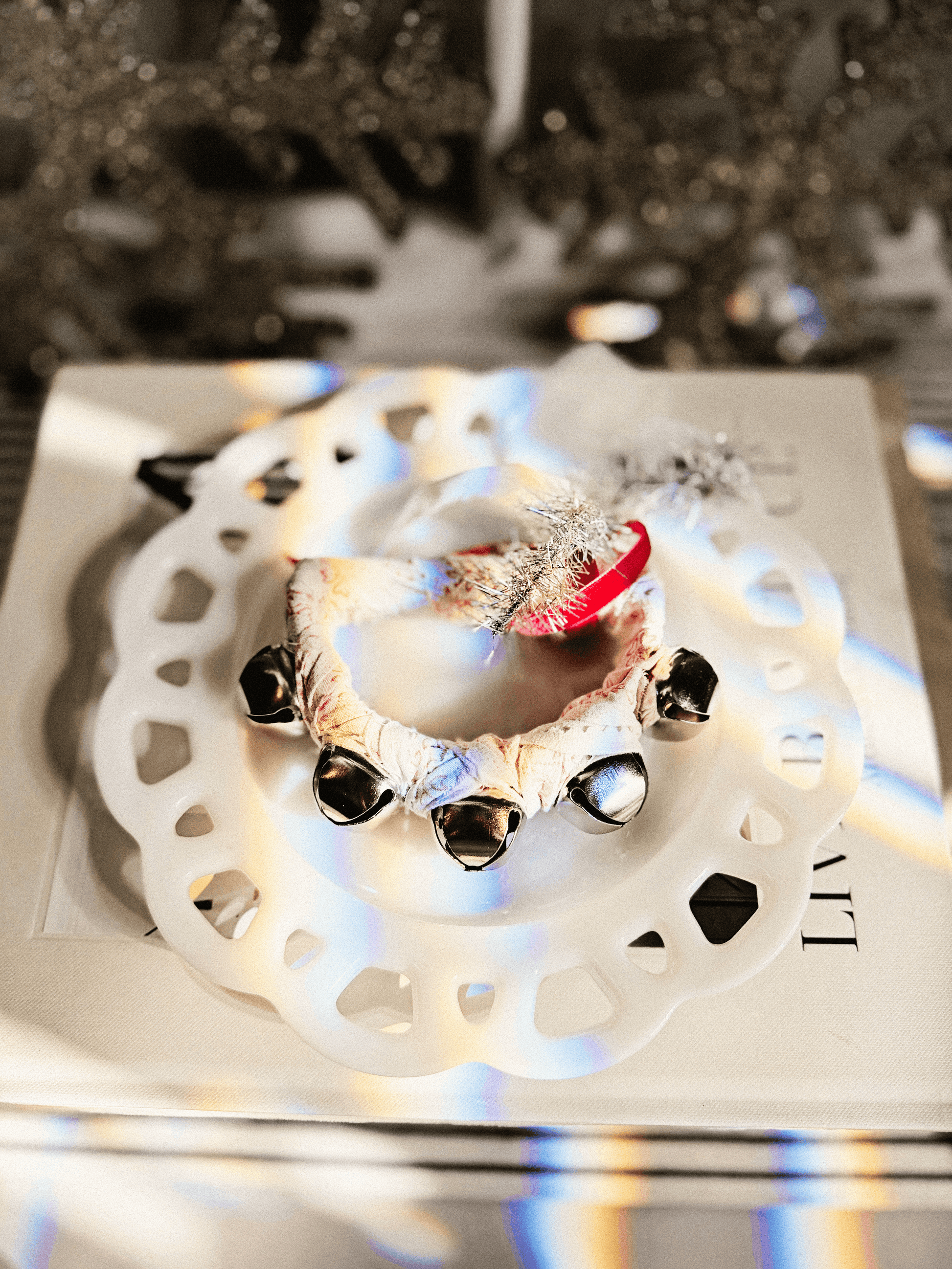 Accented with silver tinsel, snow white linen ribbon, and a touch of red velvet, this piece can be styled on a doorknob, tucked into a garland, placed on a holiday table, or simply held and rung on Christmas Eve. No two are exactly alike, each one carries its own little bit of story and soul.